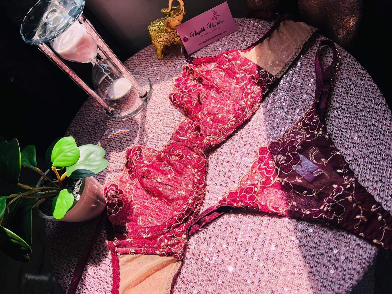 Confeccionado en un delicado encaje color vino, tela mesh y con aplicaciones en dorado, ideal para cualquier ocasión, para sentirse poderosa y aunéntica.